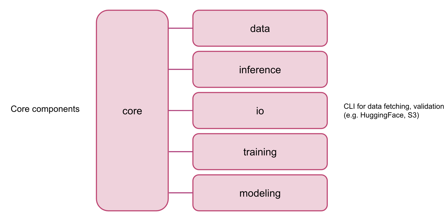 core- low-level components responsible for the heavy-lifting of the frameworkdata- data serving utilities (e.g., datasets, preprocessors, utils, etc.)io- data fetching and storage utilitiesinference- utilities for CLI/tooling to run inference pipelinemodeling- model building blocks and some of the SOTA architecturestraining- trainers, callbacks, and CLI/tooling to run the training pipeline